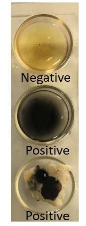 You take this opportunity to revise the iodine test. Referring to your lab manual you note that to perform the test, 1 mL of a fresh solution of 1% starch is added to a few drops of iodine solution in a well plate. This may also be done using a white tile on which drops of starch and iodine solution are mixed together. A blue-black color indicates the presence of starch, as shown in the image below (2 bottom wells).