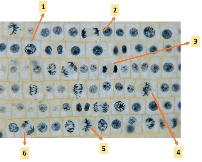 Înainte de a te uita la video pentru a afla răspunsul, încearcă să identifici etapele mitozei la celulele din regiunea meristemului din vârful rădăcinii de ceapă.