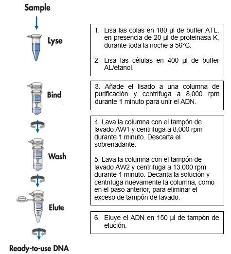 Procedes a aislar el ADN de las colas, utilizando el kit de purificación de ADN (QIAGEN), siguiendo las instrucciones del fabricante, como se detalla a continuación.